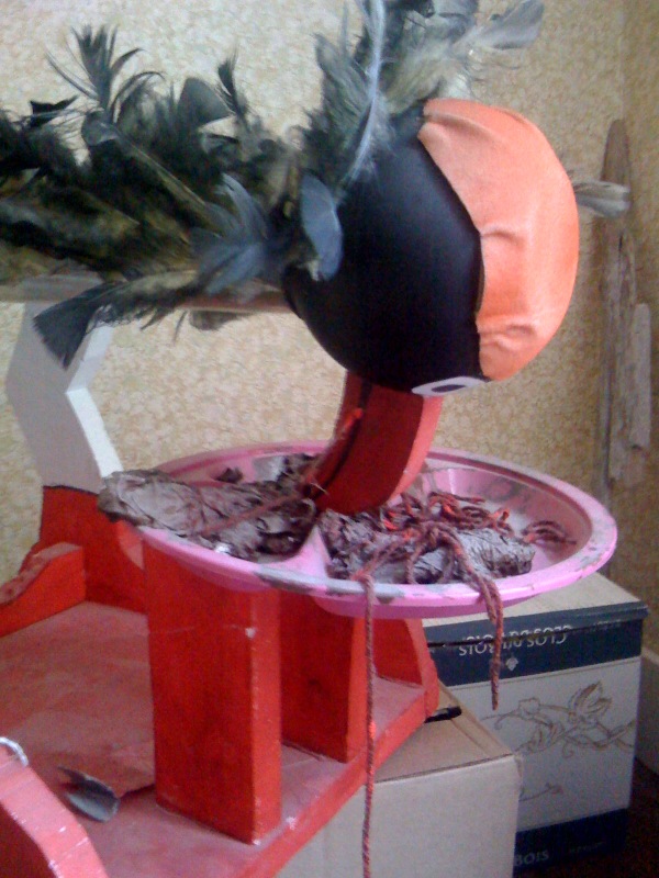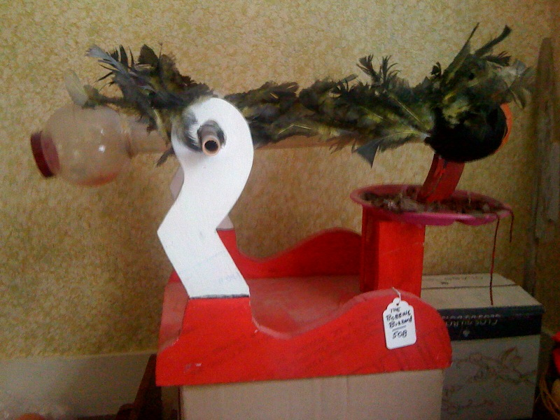 instead of bobbing into a glass of water she bobs into a plate of carrion, which looks mostly like some sort of intestines (yarn, string, crumpled up paper painted red and glued to a red plate.) She has a length of fishline attached to the back of her head to help her ‘bob’. Originally she had some red water in her posterior but it dried up before I purchased her. She was made in 1993. I have an authenticity certificate from BBI.