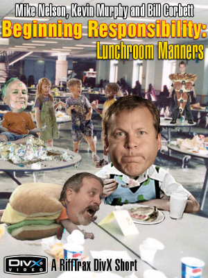 Another new short from Mike, Kevin and Bill at RiffTrax, “Beginning Responsibility: Lunchroom Manners.” Available for DivX or good old reliable “download MP3/synch up with video” combination. Only 99 cents either way you choose.