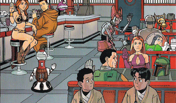 Return of the ServoWhen not being stolen by Jawas, what does Tom Servo like to do while visiting the Star Wars universe? Why, hang out at the local diner with Crow and Gypsy, of course. At least, that’s what Dark Horse comics claims on page 8 of Star Wars: Tag & Bink – Revenge of the Clone Menace. Just click on Tom to see for yourself.