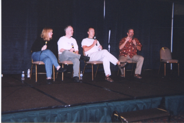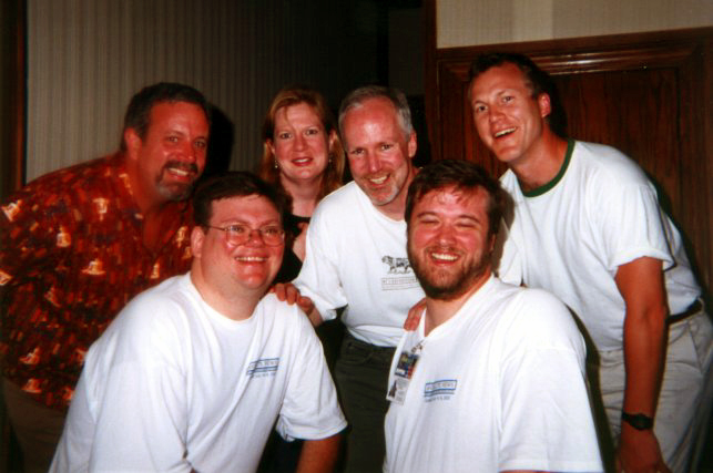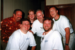 | The MST3K gang poses with Satellite News' Erhardt (on left) and Sampo. |
