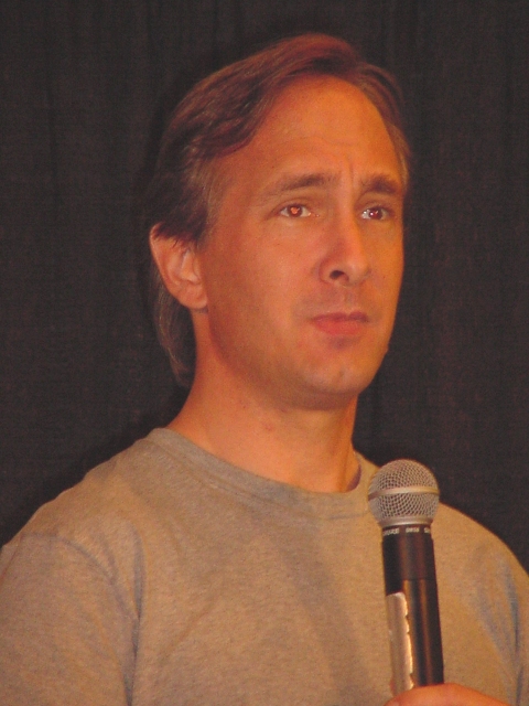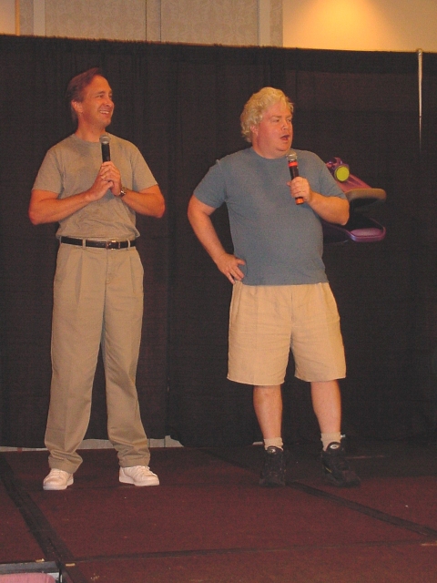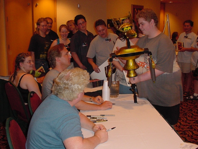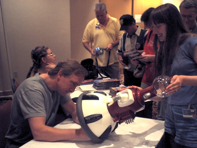 | Trace shows a convention-goer how it's done. (Sorry for the blurry shot!) |